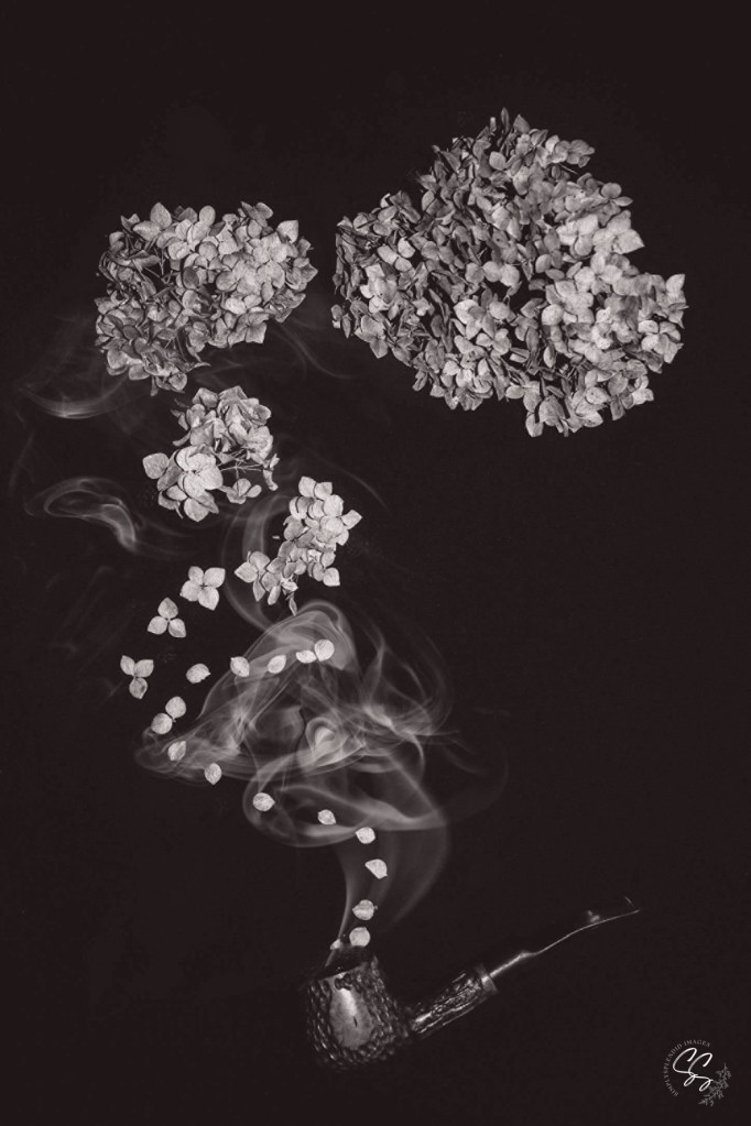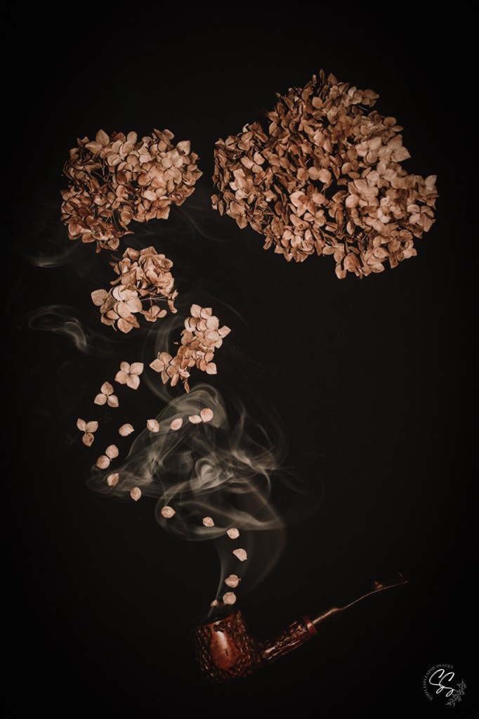 Capturing the essence of a bygone era, a weathered pipe, once cradled by my dad’s contemplative hands, now breathes whispers of memory. Beside it, dried hydrangeas from my grandma’s garden unfold their petals like delicate time-travelers. Against a velvety black background, a wistful puff of smoke swirls, carrying with it the aromatic tales of shared laughter and quiet reflections. In a whimsical fusion of artifacts and flora, the photograph becomes a magical portal, inviting us to stroll through the fragrant garden of cherished memories, where each bloom and curl of smoke whispers stories only the heart can truly comprehend.